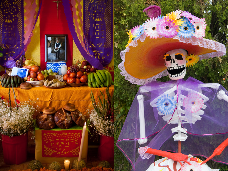 How: Families create “ofrendas”, or offerings, to honor family members who have passed. These altars are decorated with bright yellow marigold flowers, photos of the departed, and the favorite food and drink of the ones being honored. People also wear skull masks and eat sugar candy molded into the shape of skulls.
