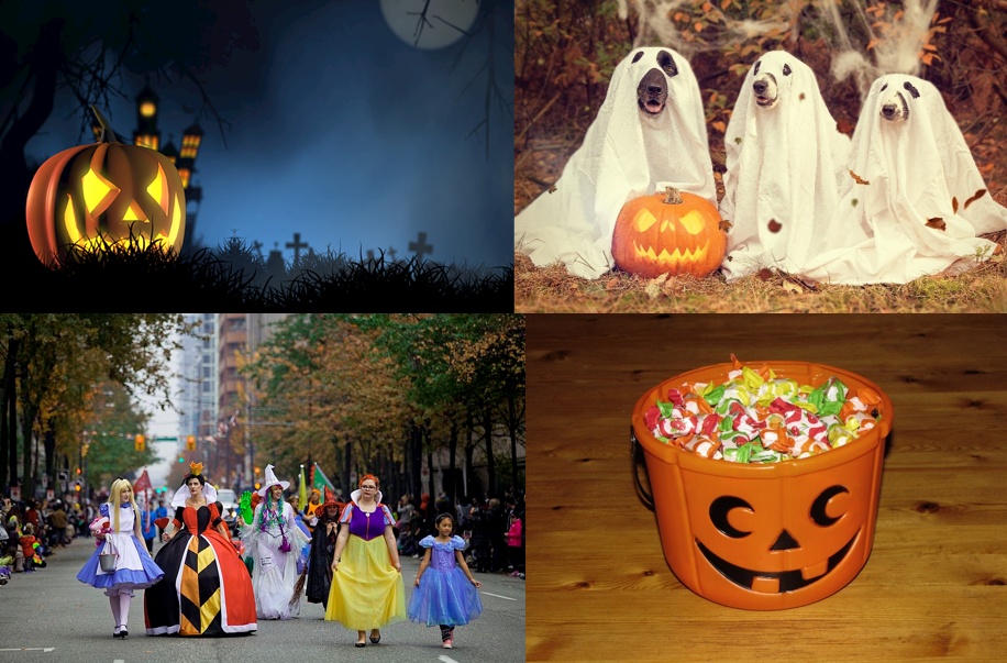 How: Over the centuries, Halloween evolved to include costume parties, trick-or-treating, pranks and games. Celebrations, especially among children, involve elaborate costumes and masks. Schools and communities hold Halloween parades. Households prepare candy treats to give to the children who go around neighborhoods “trick-or-treating“.