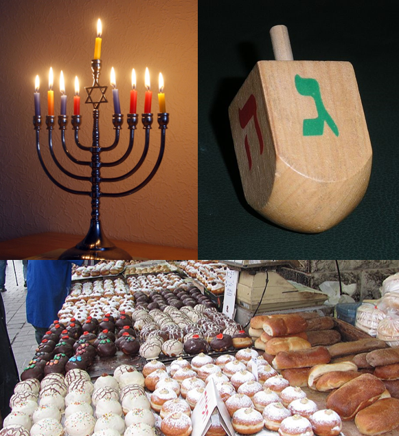How: Hanukkah is the Jewish Festival of Lights. Hanukkah celebrations revolve around the kindling of the nine-branched menorah over the course of the eight–night festival. Gifts of money known as “gelt” are given to children. It is also customary to play with a spinning top called a “dreidel”. Traditional foods include fried potato fritters called “latkes” and jam-filled doughnuts called “sufganiyot”.