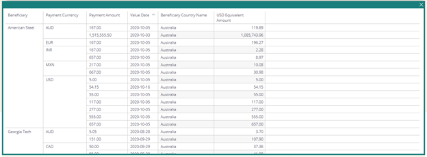This displays a breakdown of the payment amounts to each beneficiary within the selected country.