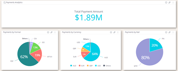 This example displays the total payments processed within a given timeframe. This includes additional supporting analytics by payment rail, payment format and payment currency.